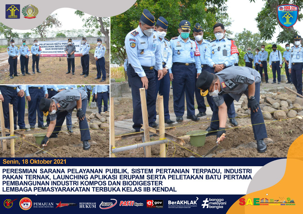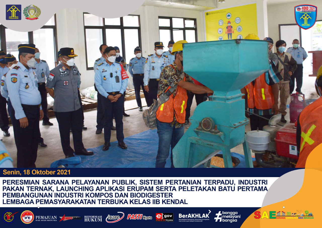 "Artinya, semua akan dimanfaatkan semaksimal mungkin guna pengembangan pertanian dan peternakan di Lapas Terbuka Kendal," jelasnya. Usai peresmian, Kepala Kanwil Kemenkumham Jateng yang didampingi Kepala Divisi Administrasi, Jusman dan Kepala Bagian Pelaporan dan Hubungan Masyarakat, Budhiarso Widhayarsono, menyempatkan diri melihat secara langsung bagaimana proses pembuatan dan pengolahan pakan ternak. Dilanjutkan dengan meletakkan batu pertama pembangunan industri kompos dan biodigester serta memotong pita tanda diresmikan ruang layanan.